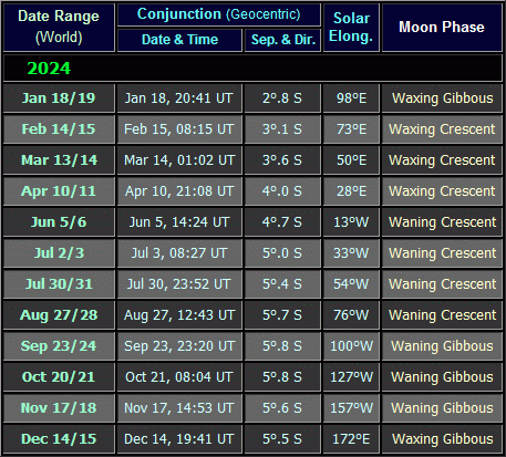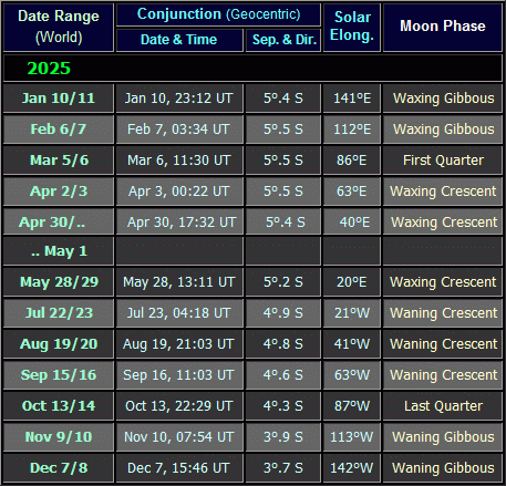 Moon near Jupiter dates for 2026 (no dates are shown for July and August because Jupiter is too close to the Sun at these times). The Date Range shows the range of dates worldwide (allowing for Time Zone differences across East and West hemispheres). Note that the dates, times and separations at conjunction (i.e. when the two bodies are at the same Right Ascension) are measured from the Earth's centre (geocentric) and not from the Earth's surface (times are Universal Time [UT], equivalent to GMT). The Sep. & Dir. column gives the angular distance (separation) and direction of the planet relative to the Moon, e.g. on April 22nd at 22:03 UT, Jupiter is 3°.5 South of the Moon's centre. The Moon Phase shows whether the Moon is waxing (between New Moon and Full Moon), waning (between Full Moon and New Moon), at crescent phase (less than half of the lunar disk illuminated) or gibbous phase (more than half but less than fully illuminated). Moon near Jupiter dates can also be viewed for 2022, 2023, 2024 and 2025. |