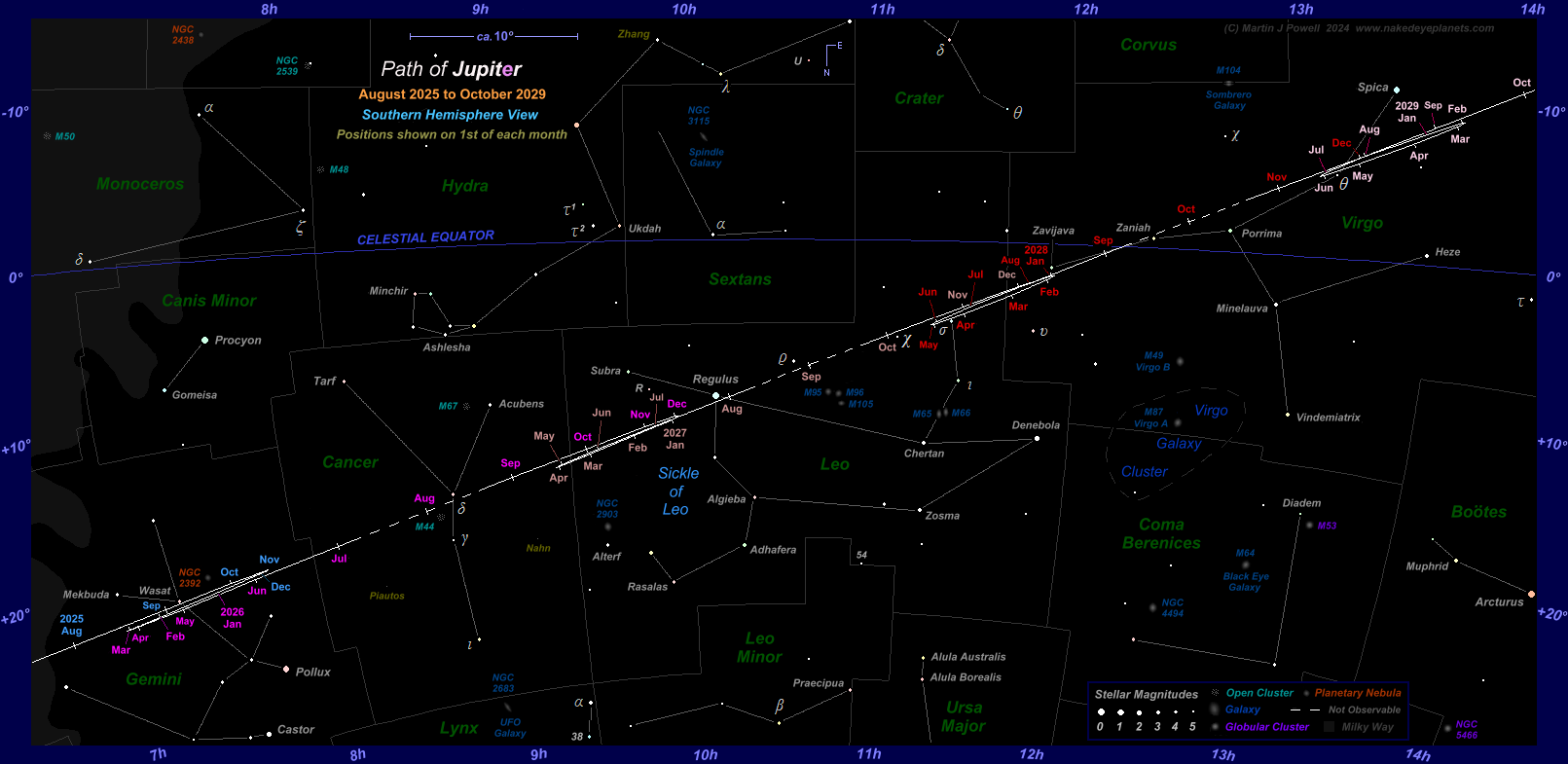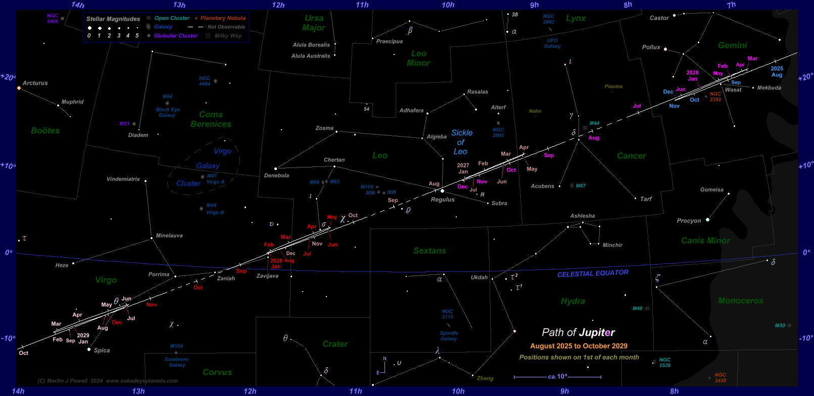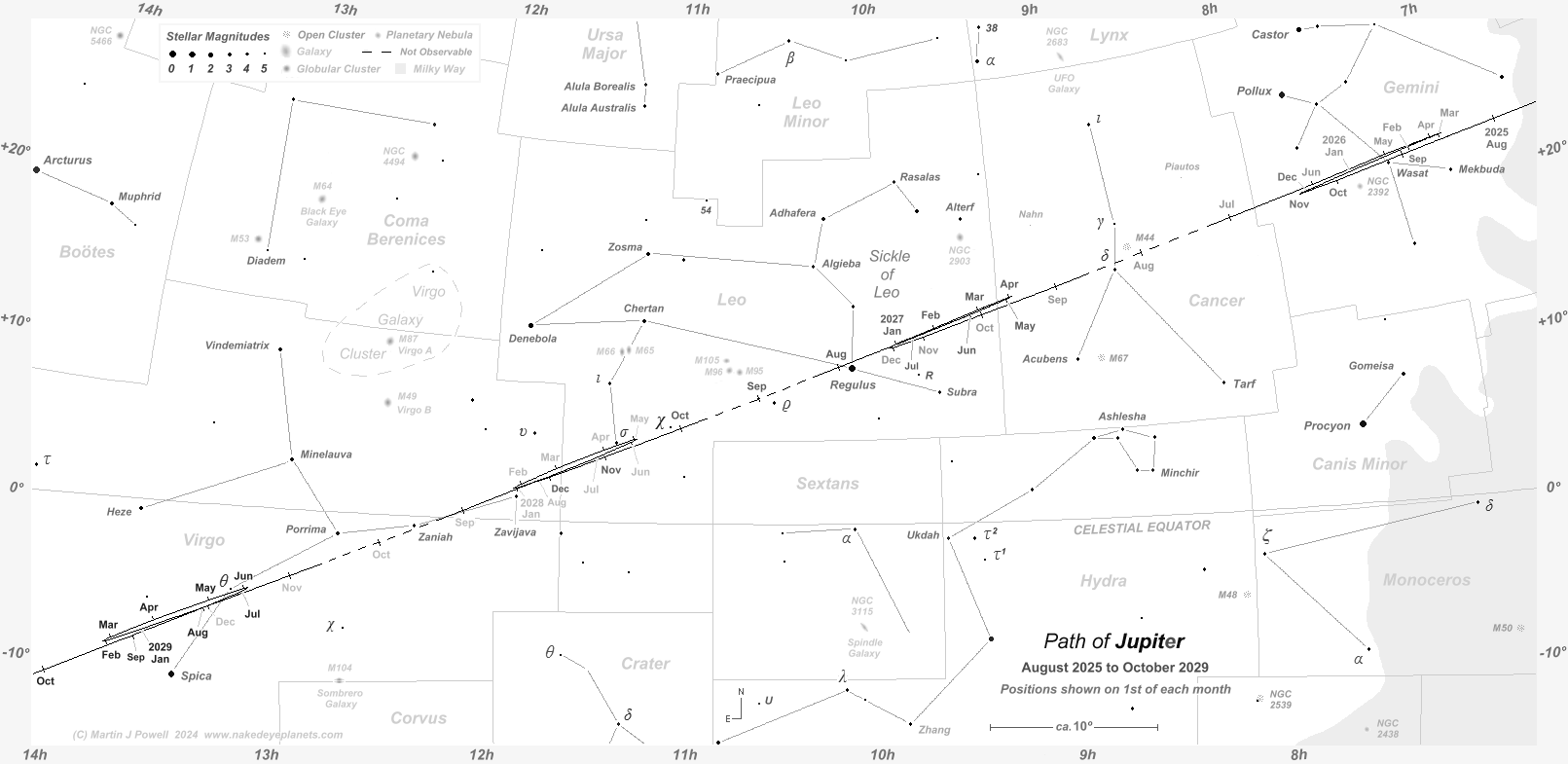 The path of Jupiter against the background stars of Gemini, Cancer, Leo and Virgo from August 2025 to October 2029, with positions marked on the 1st of each month (click on the thumbnail for the full-size image). Periods when the planet is unobservable (i.e. when it is too close to the Sun, or passes behind it) are indicated by a dashed line; hence the planet becomes lost from view (in the evening sky) in early July 2026 and becomes visible again (in the morning sky) in mid-August of that year. The chart shows the changing shape of a planet's apparent looping formation as it moves through the zodiac: Jupiter describes a zig-zag formation in Gemini in the 2025-26 observing period, followed by a 'hybrid' loop (half loop, half zig-zag) in western Leo in the 2026-27 period, transforming into Northward-facing loops in both 2027-28 and 2028-29. The star map applies to observers in the Northern hemisphere (i.e. North is up); for the Southern hemisphere view, click here. The faintest stars on the map have an apparent magnitude of about +4.8. Printer-friendly versions of this chart are available for Northern and Southern hemisphere views. Astronomical co-ordinates of Right Ascension (longitude, measured Eastwards in hrs:mins from the First Point of Aries) and Declination (latitude, measured in degrees North or South of the celestial equator) are marked around the border of the chart. Click here to see a 'clean' star map of the area (i.e. without planet path); observers may wish to use the 'clean' star map as an aid to plotting the planet's position on a specific night - in which case, a printable version can be found here. Night sky photographs of the region, together with dates of the planet's passage of the brighter stars, can be seen below. The three star names shown in yellow-green were officially adopted by the International Astronomical Union (IAU) in 2017 and 2018, derived from Persian, Coptic and Chinese mythology (for more details see the IAU's Working Group on Star Names pages). |