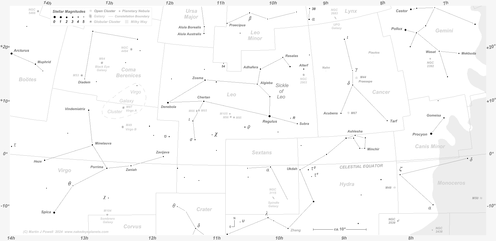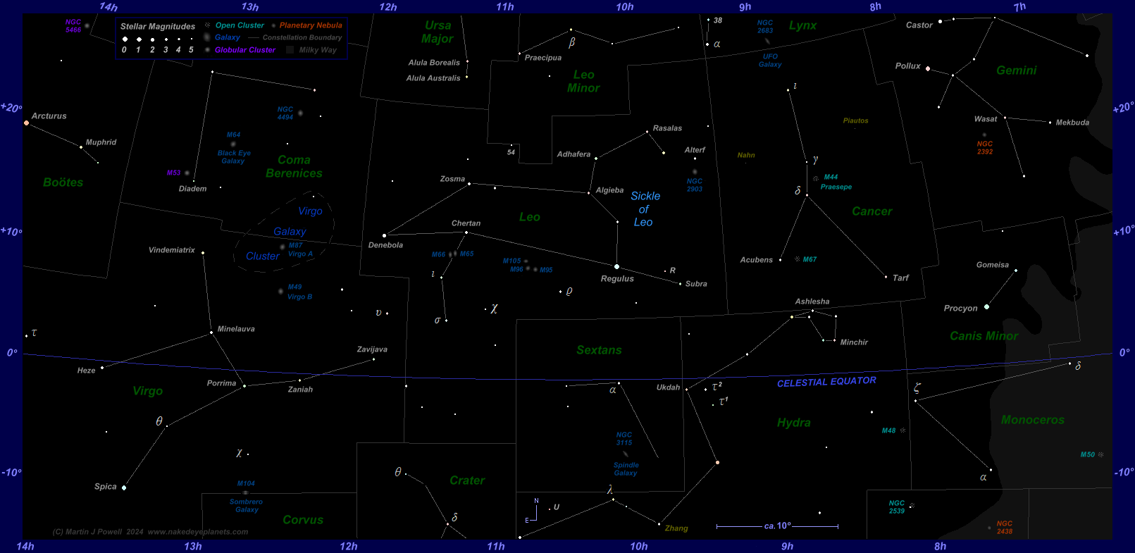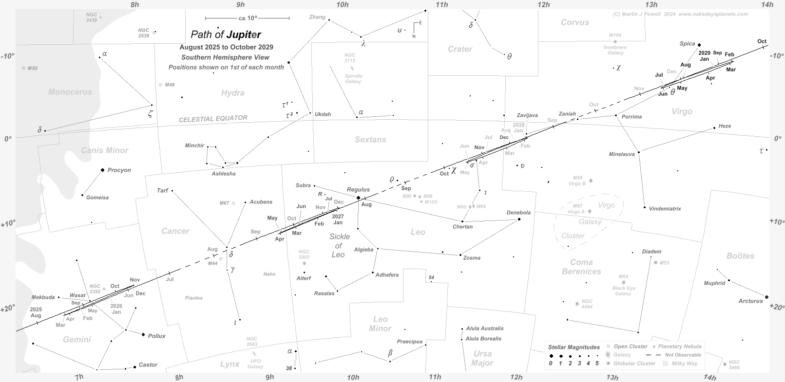 The path of Jupiter against the background stars of Gemini, Cancer, Leo and Virgo from August 2025 to October 2029, with positions marked on the 1st of each month (click on the thumbnail for the full-size image). Periods when the planet is unobservable (i.e. when it is too close to the Sun, or passes behind it) are indicated by a dashed line; hence the planet becomes lost from view (in the evening sky) in early July 2026 and becomes visible again (in the morning sky) in mid-August of that year. The chart shows the changing shape of a planet's apparent looping formation as it moves through the zodiac: Jupiter describes a zig-zag formation in Gemini in the 2025-26 observing period, followed by a 'hybrid' loop (half loop, half zig-zag) in western Leo in the 2026-27 period, transforming into Northward-facing loops in both 2027-28 and 2028-29. The star map applies to observers in the Northern hemisphere (i.e. North is up); for the Southern hemisphere view, click here. The faintest stars on the map have an apparent magnitude of about +4.8. Printer-friendly versions of this chart are available for Northern and Southern hemisphere views. Astronomical co-ordinates of Right Ascension (longitude, measured Eastwards in hrs:mins from the First Point of Aries) and Declination (latitude, measured in degrees North or South of the celestial equator) are marked around the border of the chart. Click here to see a 'clean' star map of the area (i.e. without planet path); observers may wish to use the 'clean' star map as an aid to plotting the planet's position on a specific night - in which case, a printable version can be found here. Night sky photographs of the region, together with dates of the planet's passage of the brighter stars, can be seen below. The three star names shown in yellow-green were officially adopted by the International Astronomical Union (IAU) in 2017 and 2018, derived from Persian, Coptic and Chinese mythology (for more details see the IAU's Working Group on Star Names pages). |