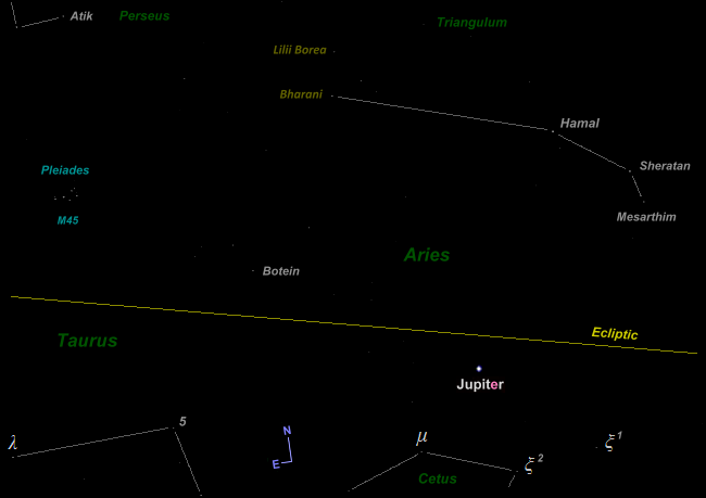Wasat around mid-January. Now in the evening sky, Jupiter continues its Westward motion and reaches its Western stationary point in mid-March, positioned several