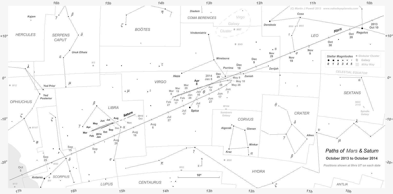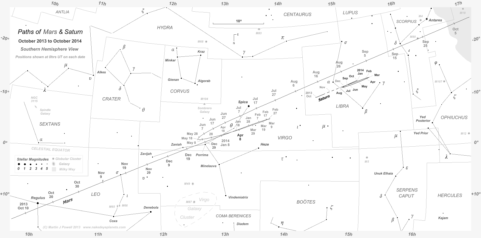 Lying to both North and South of Mars' path through the zodiac from 2013-14 are numerous interesting deep-sky objects (objects beyond our Solar System) which can be seen through small telescopes and binoculars. More details can be found on the Zodiacal Sky: Cancer-Leo-Virgo page.