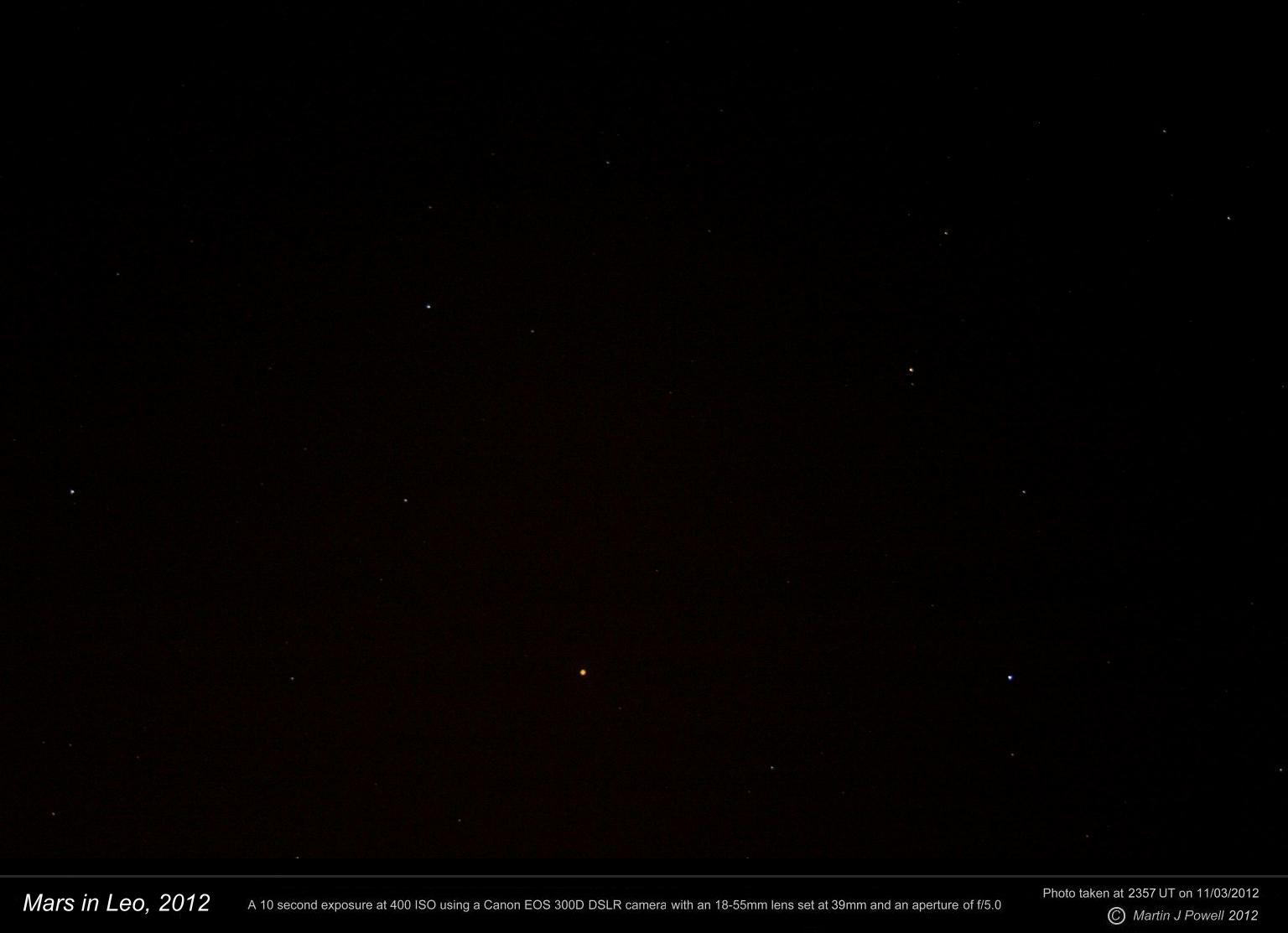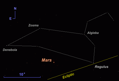 Mars in Leo, 2012 The Red Planet previously reached opposition in Leo in early March 2012; this photograph was taken about a week after that date, when it shone at magnitude -1.2 (move your cursor over the image - or click here - to identify the stars, and click on thumbnail for a full-size picture). |