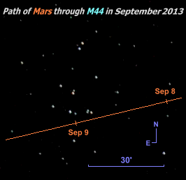 Mars in M44, September 8th-9th 2013 Mars crossed the open cluster M44 (Praesepe) in the constellation of Cancer (move your pointer over the image - or click here - to see the track of the planet, marked at 0h UT on each date). |
