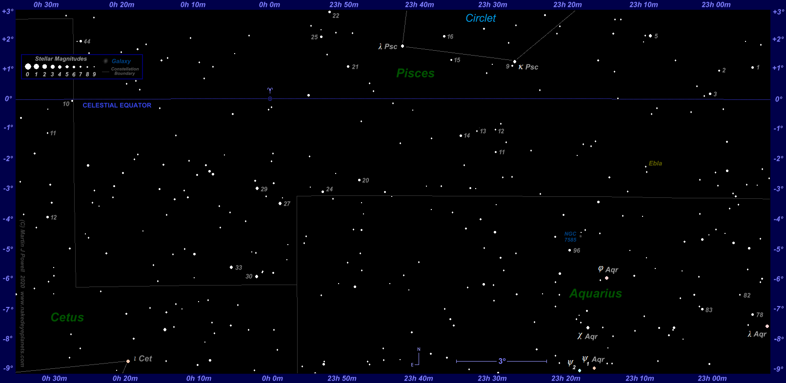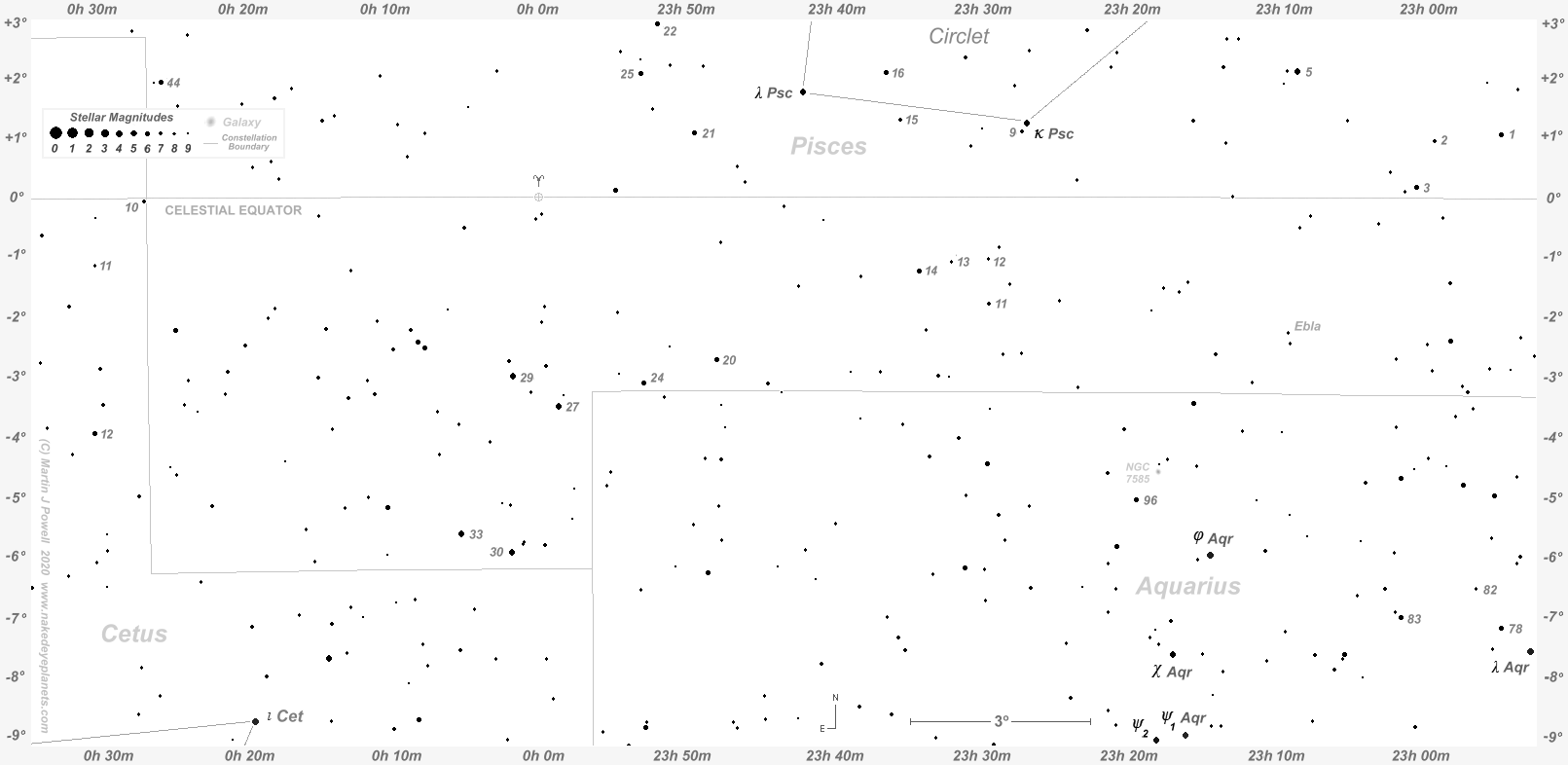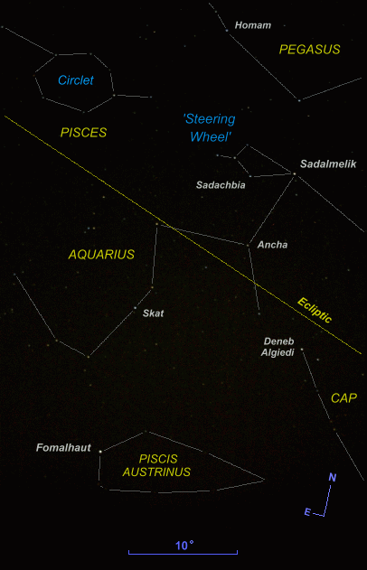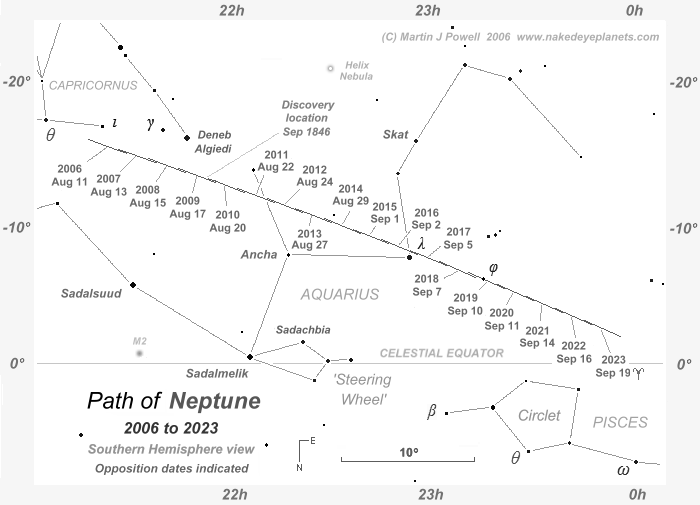 Eastern Aquarius and the Circlet of Pisces A photograph showing the region of the night sky through which Neptune passed between 2006 and 2023. Stars can be seen down to about magnitude +7.5 (move your pointer over the image - or click here - to see an annotated version of the photograph and click on the thumbnail to see the full-size picture) |