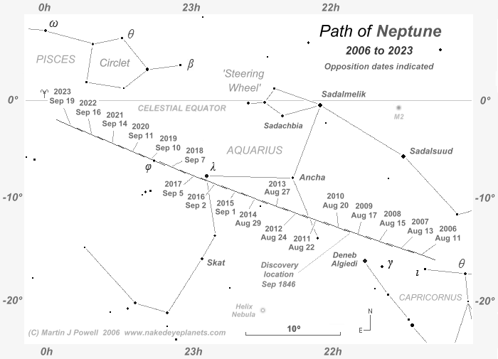 Star map showing the path of Neptune against the background stars of Capricornus and Aquarius from 2006 to 2023. Positions are marked for each opposition date. Neptune began the period describing a series of shallow 'hybrid' formations (part zig-zag, part loop) having crossed the ecliptic from North to South in 2003. By the time the planet was South of the Circlet of Pisces, the 'hybrid' loops had transformed into conventional, South-facing loops (the individual 'loops' are not discernible in this chart because of its small scale; instead, each loop appears as an oblique line). Note that, because the angular width of Neptune's loops (about 2º.8 across) are greater than its annual orbital motion against the background stars, each successive loop overlaps (in longitude) with the next. The star map applies to observers in the Northern hemisphere (i.e. North is up); for the Southern hemisphere view, click here. The faintest stars shown on the map have an apparent magnitude of about +4.9. Printer-friendly versions of this chart are available for Northern and Southern hemisphere views. Astronomical co-ordinates of Right Ascension (longitude, measured Eastwards in hrs:mins from the First Point of Aries) and Declination (latitude, measured in degrees North or South of the celestial equator) are marked around the border of the chart. |