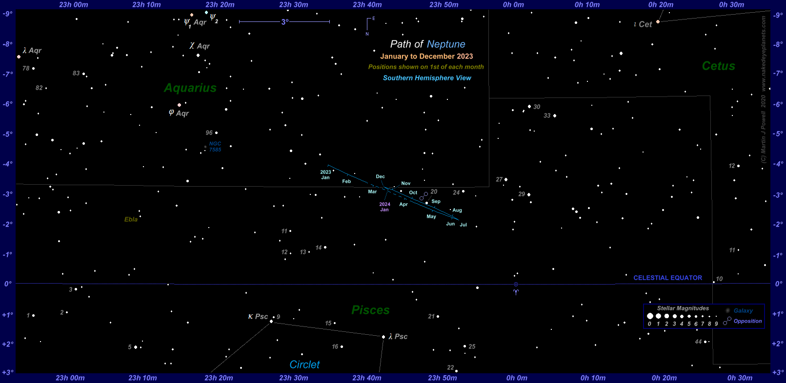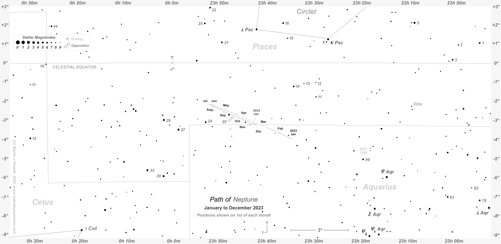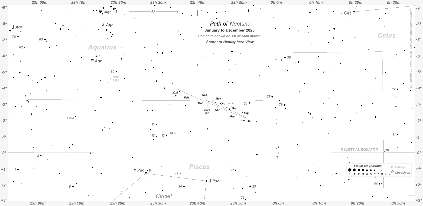 The path of Neptune in North-eastern Aquarius/South-western Pisces during 2023, with positions marked on the first day of each month (click on the thumbnail for the full-size image). A Southern hemisphere view can be found here. Where the planet was too close to the Sun to observe, the path is shown as a dashed line. Neptune