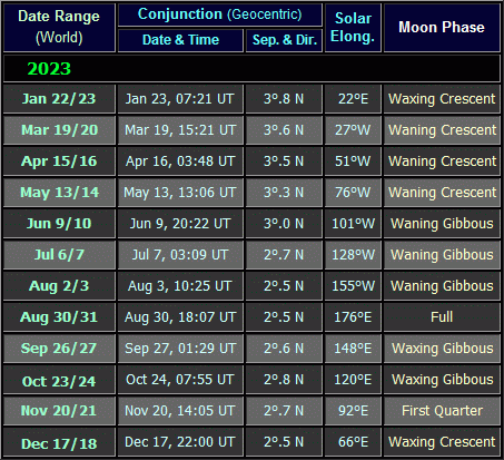 Moon near Saturn dates for 2025. The Date Range shows the range of dates worldwide (allowing for Time Zone differences across East and West hemispheres). Note that the dates, times and separations at conjunction (i.e. when the two bodies are at the same Right Ascension) are measured from the Earth's centre (geocentric) and not from the Earth's surface (times are given in Universal Time [UT], equivalent to GMT). The Sep. & Dir. column gives the angular distance (separation) and direction of the planet relative to the Moon, e.g. on May 22nd at 17:59 UT, Saturn is positioned 2°.8 South of the Moon's centre. The Moon Phase shows whether the Moon is waxing (between New Moon and Full Moon), waning (between Full Moon and New Moon), at crescent phase (less than half of the lunar disk illuminated) or gibbous phase (more than half but less than fully illuminated). Moon near Saturn dates can also be viewed for 2023 and 2024. |