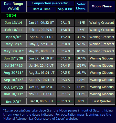 Saturn conjunctions with other planets from January 2023 to June 2025 The column headed 'UT' is the Universal Time (equivalent to GMT) of the conjunction (in hrs : mins). The separation (column 'Sep') is the angular distance between the two planets, measured relative to Saturn, hence on 2024 Apr 11, Mars is positioned 0°.5 North of Saturn at the time shown. The 'Favourable Hemisphere' column shows the Hemisphere in which the conjunction will be best observed. Note that observers located close to the Northern/Southern visibility boundary of any given conjunction will find it difficult or impossible to observe because of low altitude and/or bright twilight. In the 'When Visible' column, a distinction is made between Dawn/Morning visibility and Dusk/Evening visibility; the terms Dawn/Dusk refer specifically to the twilight period before sunrise/after sunset, whilst the terms Evening/Morning refer to the period after darkness falls/before twilight begins (some conjunctions take place in darkness, others do not, depending upon latitude). The 'Con' column shows the constellation in which the planets are positioned at the time of the conjunction. To find the direction in which the conjunction will be seen, note down the constellation in which the planets are located ('Con' column) on the required date and find the constellation's rising direction (for Dawn/Morning conjunctions) or setting direction (for Dusk/Evening conjunctions) for your particular latitude in the Rise-Set direction table. |