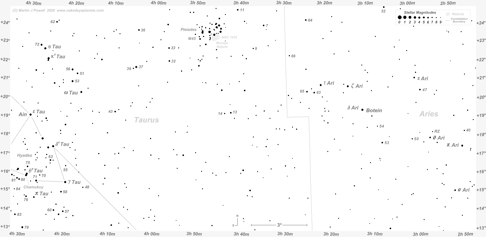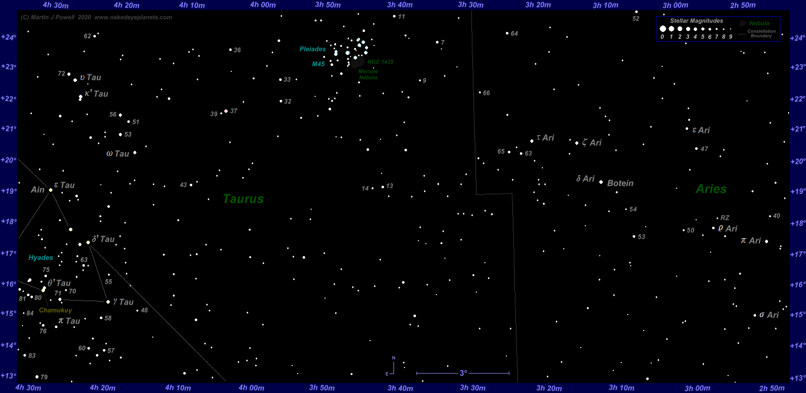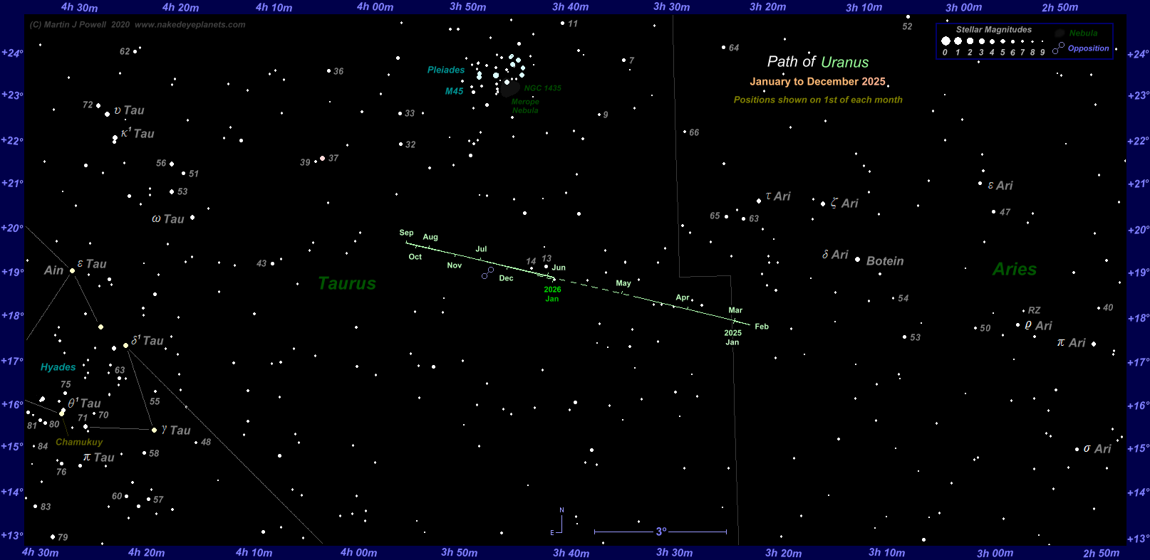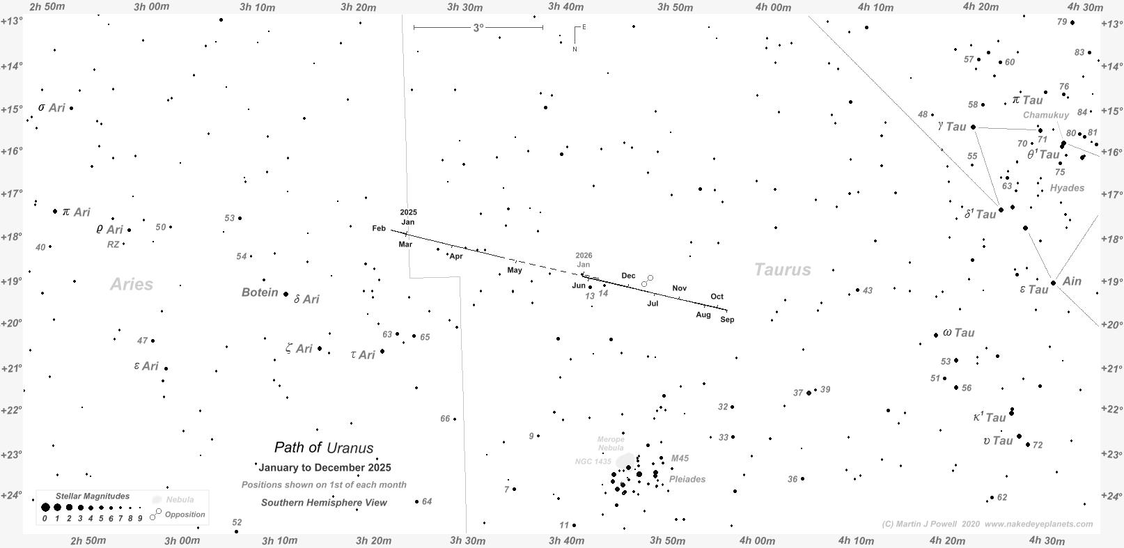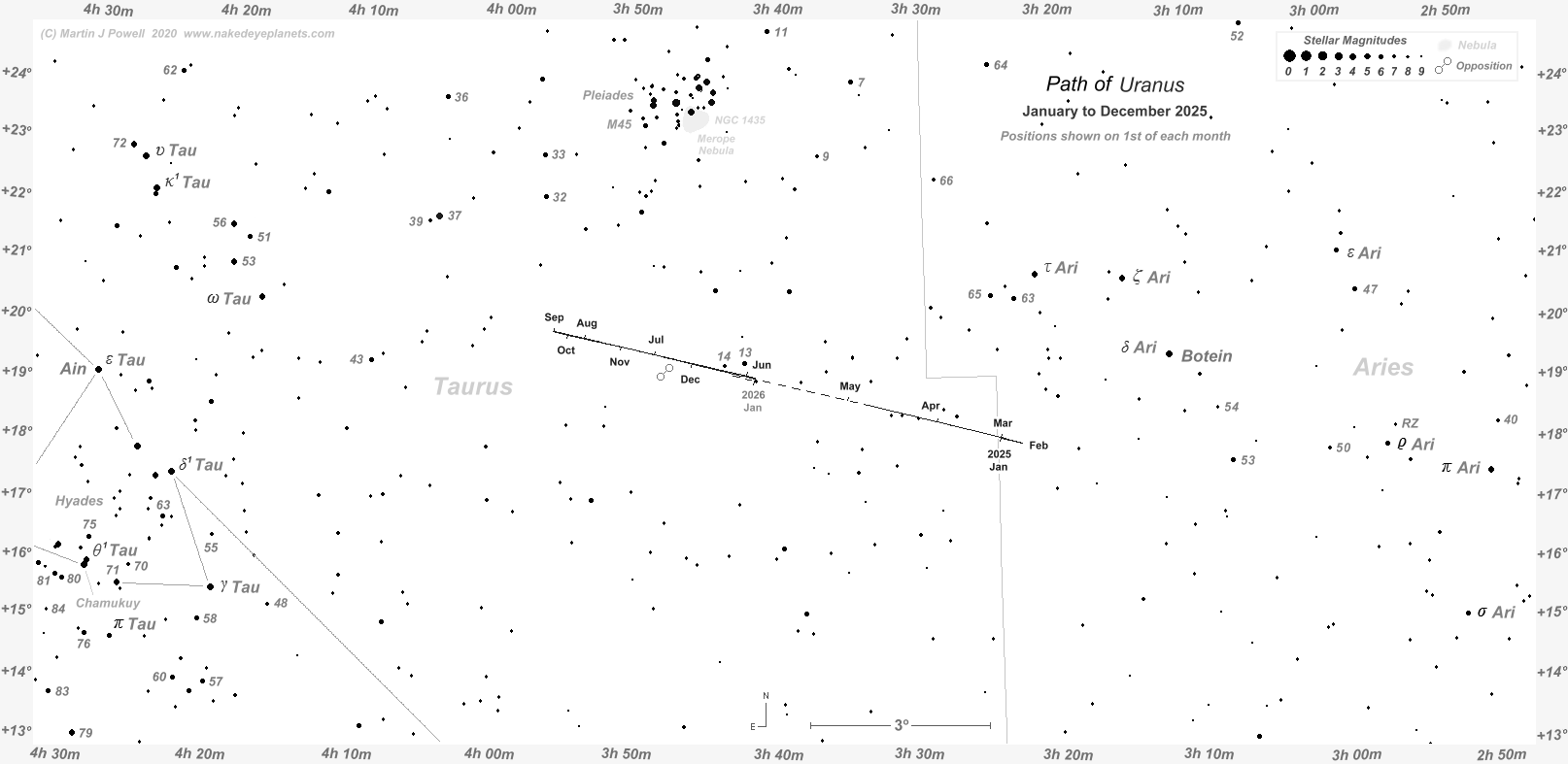 During most of 2025 Uranus can be found just inside the western border of Taurus, the Bull. It reaches opposition in November, positioned about 4° South of the Pleiades (M45) star cluster.