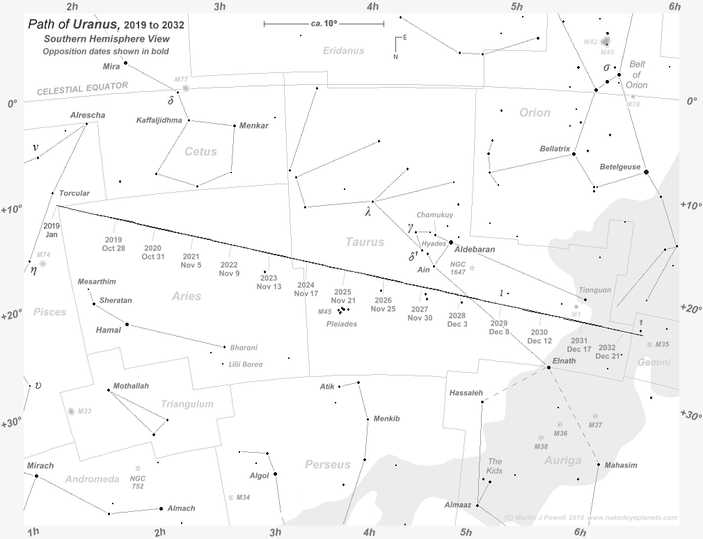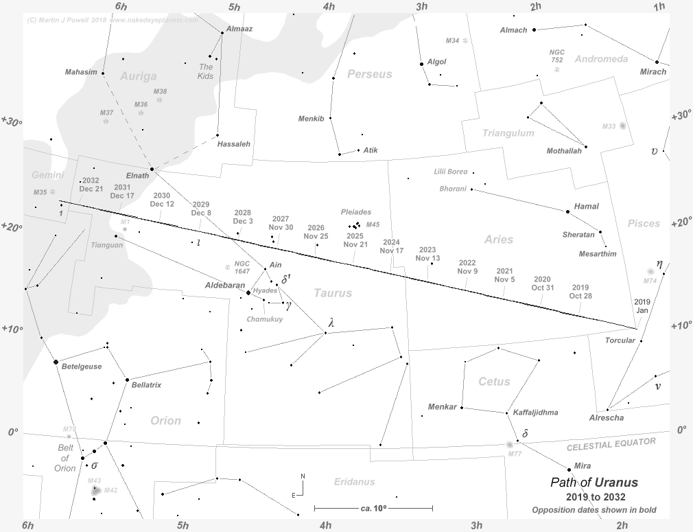 Star map showing the path of Uranus against the background stars of Aries and Taurus from 2019 to 2032, with the position of each opposition date marked. From 2019 through 2022 Uranus describes a series of shallow, Southward-facing loops because the planet is then South of the ecliptic (the individual loops are about 4º wide and are not discernible in this map because of its small scale). From 2023 through 2025 Uranus describes hybrid loops (half loop, half zig-zag) followed by zig-zag formations from 2026 to 2030, the planet crossing to the North of the ecliptic in mid-2029. Uranus then returns to hybrid loops from 2031 through to the end of the period. The star map applies to observers in the Northern hemisphere (i.e. North is up); for the Southern hemisphere view, click here. The faintest stars shown on the map have an apparent magnitude of about +4.8. Printer-friendly versions of this chart are available for Northern and Southern hemisphere views. Astronomical co-ordinates of Right Ascension (longitude, measured Eastwards in hrs:mins from the First Point of Aries) and Declination (latitude, measured in degrees North or South of the celestial equator) are marked around the border of the chart. Star names shown in yellow-green were officially adopted by the International Astronomical Union (IAU) in 2017. Three of the four such star names shown on this chart were drawn from Chinese, Hindu and Mayan mythology (for more details see the IAU's Working Group on Star Names pages). The above chart will help in finding the general location of the planet throughout the period in question, however a detailed finder chart will be required to pinpoint the planet precisely - of which, see below. |