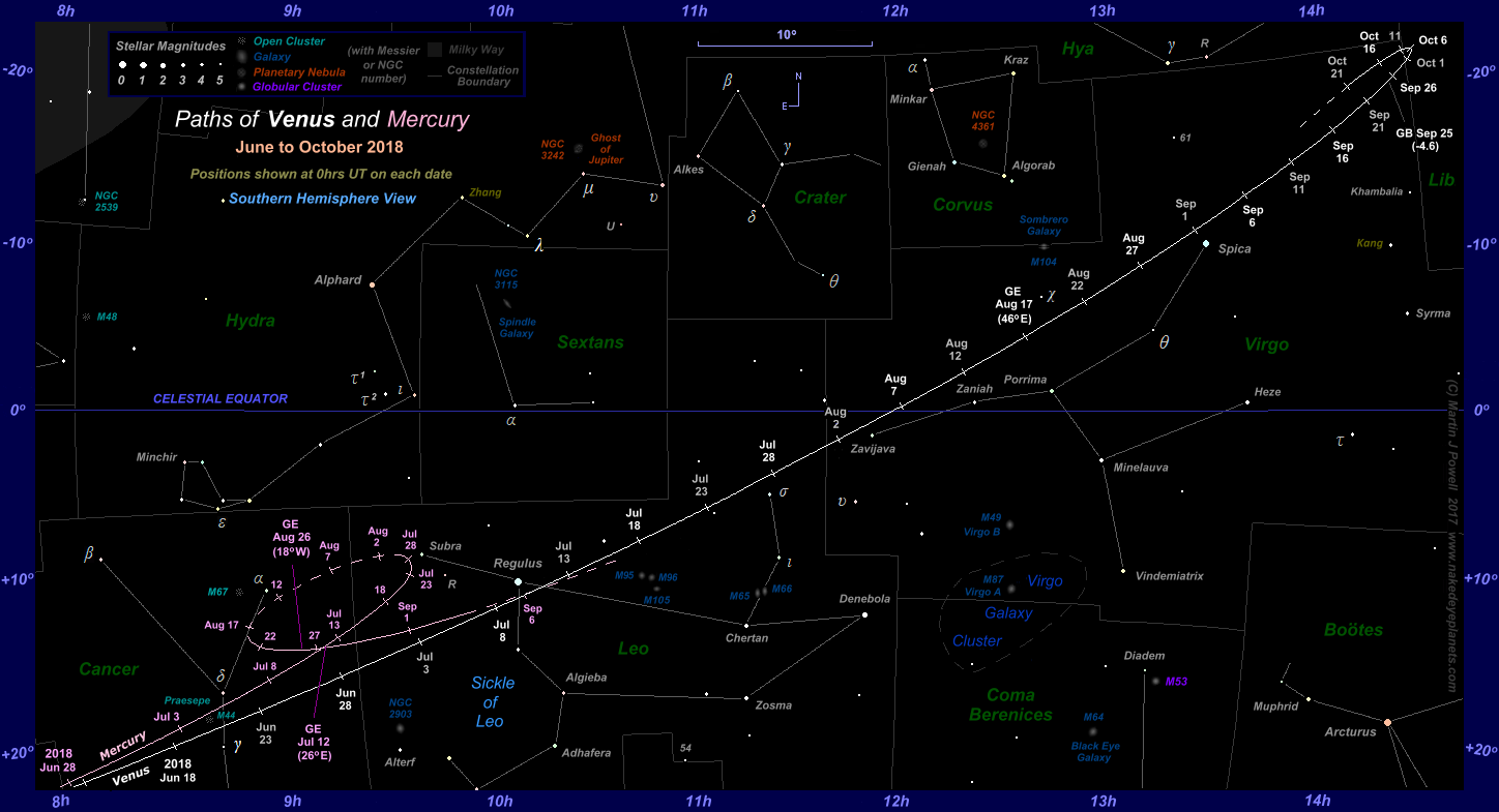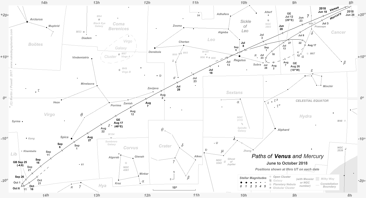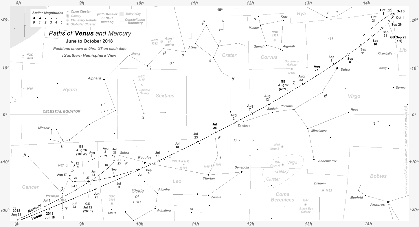The paths of Venus and Mercury through the zodiac constellations during the latter part of Venus' evening apparition in 2018 (click on the thumbnail for the full-size image). The earlier part appears in the star chart below. Positions are plotted for 0 hrs Universal Time (UT) at 5-day intervals. For Venus, apparition data for the dates shown in bright white (at 10-day intervals) are included in the table below. Wherever a planet was too close to the Sun to view, the path is shown by a dashed line (- -). For Mercury, both evening and morning apparitions are included. Hence Mercury's evening apparition drew to a close in late July 2018. It then became lost from view in the evening twilight as it headed towards inferior conjunction with the Sun. The planet then re-emerged in the dawn twilight in mid-August for a morning apparition which lasted through to early Sepetmber. Because Mercury is mostly seen in twilight, many of the fainter stars shown in the planet's vicinity may not have been visible when the planet itself was observed. The positions at which Mercury and Venus attained greatest elongation from the Sun are indicated by the letters 'GE', with the solar elongation angle in brackets. The June/July evening apparition of Mercury favoured Southern hemisphere observers (who should refer to the Southern hemisphere chart for a more appropriate orientation) whilst the morning apparition of August/Sepember favoured Northern hemisphere observers. The position at which Venus attained greatest brilliancy for this apparition (apparent magnitude = -4.6) is shown by the letters 'GB'. Click here to see a 'clean' star map of the area (i.e. without planet paths); a printable version can be found here. The faintest stars shown on the chart have an apparent magnitude of about +4.8. Printer-friendly versions of this chart are available for Northern and Southern hemisphere views. Astronomical co-ordinates of Right Ascension (longitude, measured Eastwards in hrs:mins) and Declination (latitude, measured in degrees North or South of the celestial equator) are marked around the border of the chart. Star names shown in yellow-green were officially adopted by the International Astronomical Union (IAU) in 2017. The two such star names shown on this chart were drawn from Chinese mythology (more details are given in the main text). |