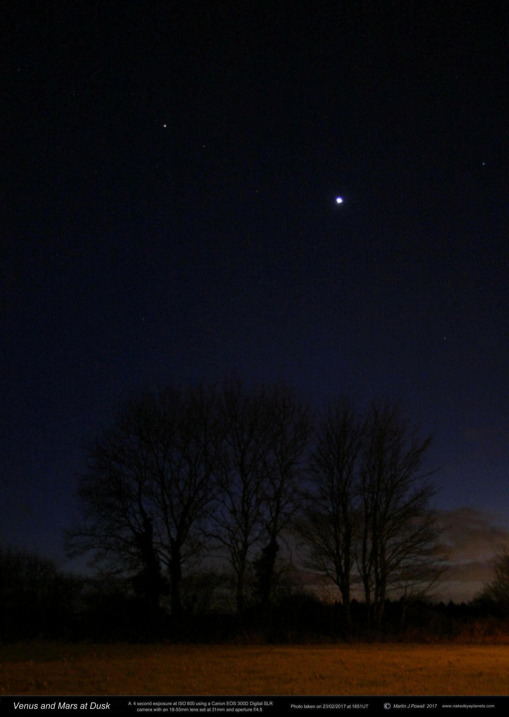 Venus and Mars in the dusk sky in February 2017, photographed by the writer five days after Venus reached peak brilliancy. Mars is to the upper left of Venus (click on the thumbnail for the full-size picture). |