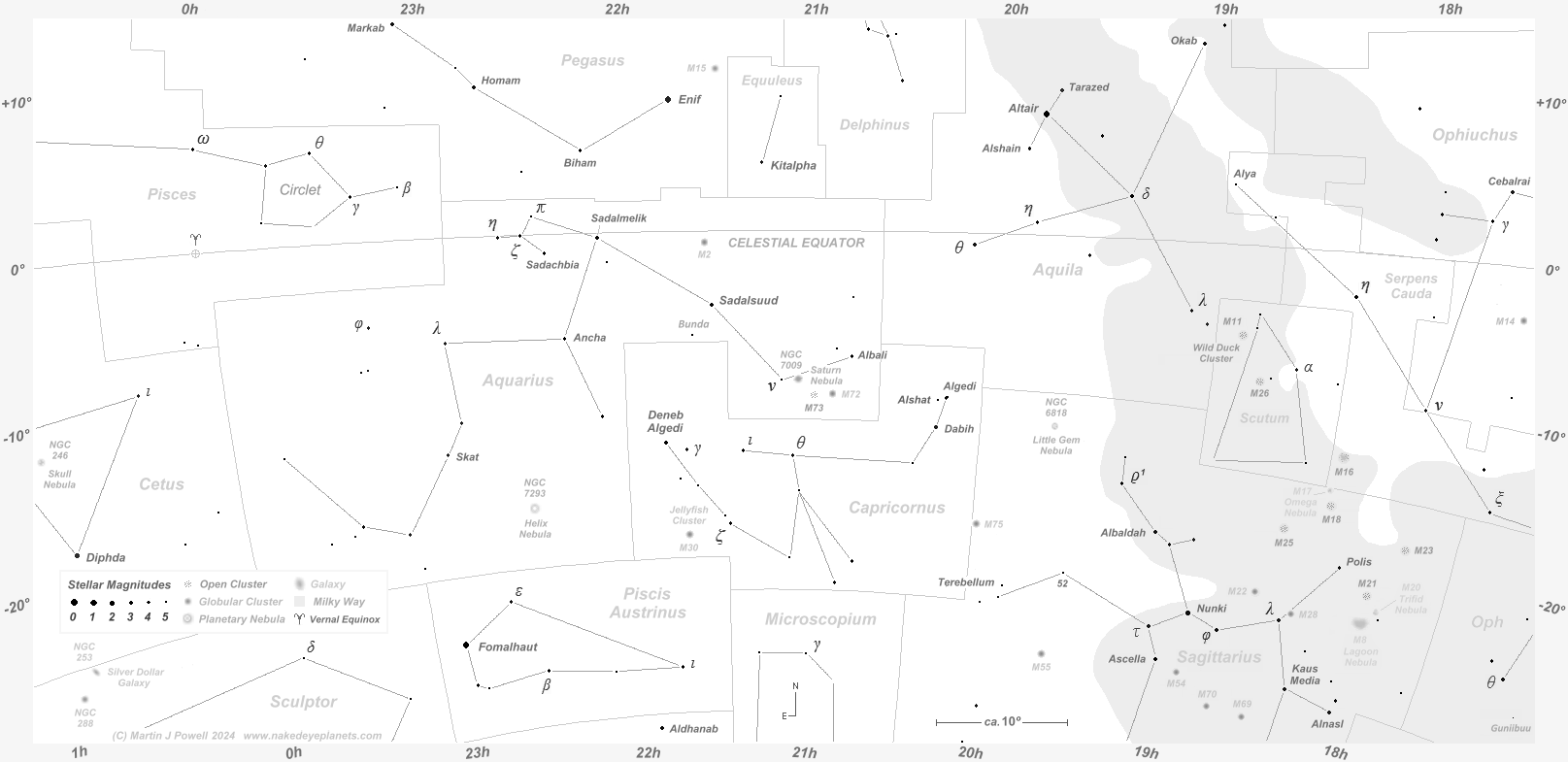 On February 3rd Venus passed 3°.9 to the North of Neptune, a planet which at this time was magnitude +7.9 and is only ever visible with optical aid. This relatively wide conjunction was best seen from the Northern hemisphere; see the planetary conjunctions section below for more observational details. Neptune entered Pisces for the long-term in December 2023, having previously been situated in Aquarius for over 12 years. The planet reached its peak brightness - only 0.1 magnitudes brighter - in the previous September but would become unobservable in the solar glare by the end of February.