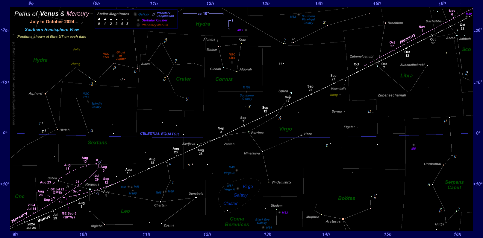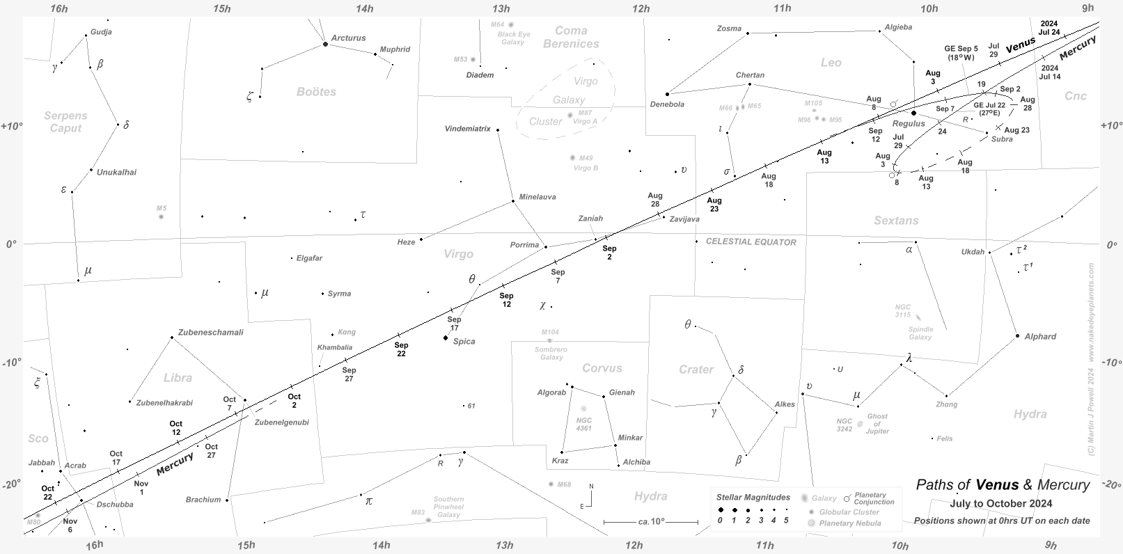 Now visible from all except higher Northern latitudes, Venus entered Leo, the Lion, on July 26th, with Mercury (mag. +0.7) located 12°.7 to its ESE.