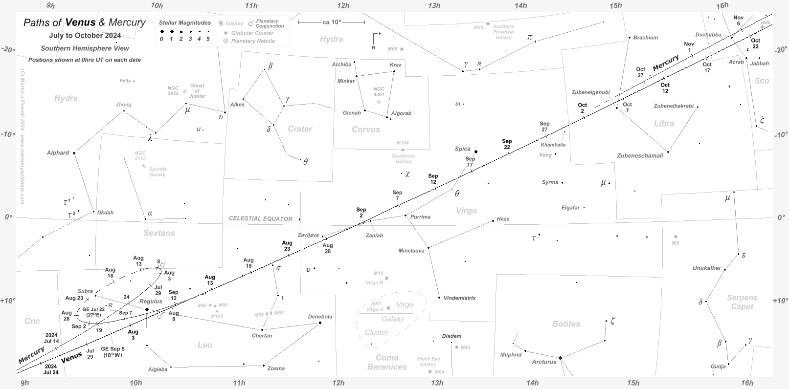 As Venus became visible from mid-Northern latitudes around mid-July, it joined the planet Mercury in the evening sky. Mercury, then in the Eastern half of Cancer and shining at magnitude +0.4, had been an evening object since early July, visible towards the North-west for a short period at dusk. This was Mercury's second evening apparition of 2024 and the first of three paired apparitions which took place between the two planets during Venus' 2024-25 evening apparition (a paired apparition being when the two planets are visible together for a prolonged period of time, either in the morning sky or the evening sky). Due to Solar System geometry, apparitions of Mercury typically favour either Northern or Southern hemisphere observers; on this occasion the Southern hemisphere was favoured. In mid-July the planet's motion was East-south-eastwards against the stars, entering Leo, the Lion on July 15th and moving to the South of the ecliptic (the apparent path of the Sun, which the Moon and planets follow very closely) on July 17th. During this period Venus and Mercury maintained a steady distance apart of 14°.7, but from July 19th the angular distance between them slowly reduced, from 14°.6 on the 19th to 14°.3 on the 21st. Mercury reached its greatest elongation from the Sun (26°.9 East) on July 22nd, positioned 14°.1 to the ESE of Venus.