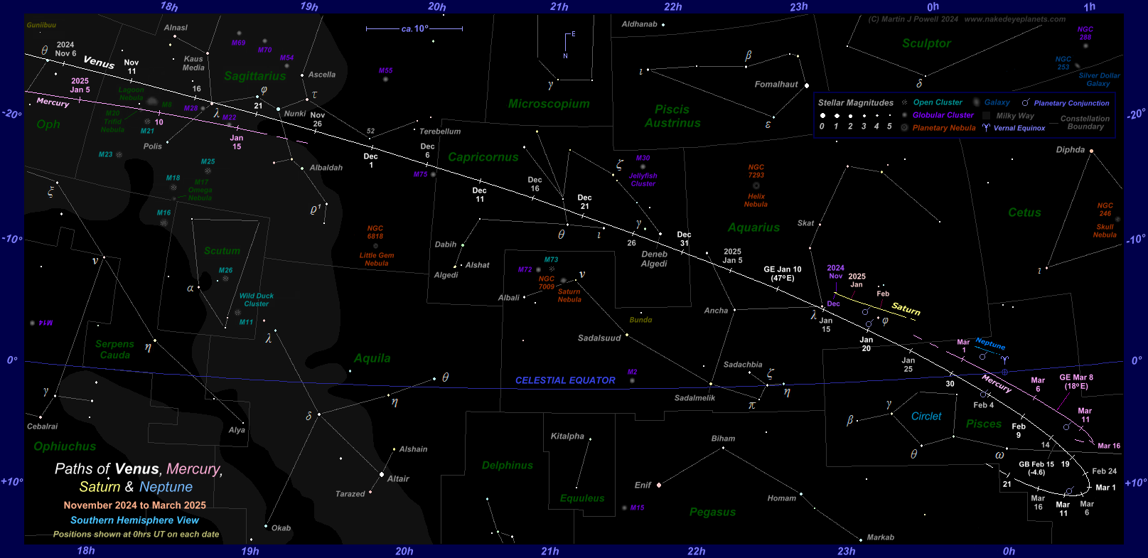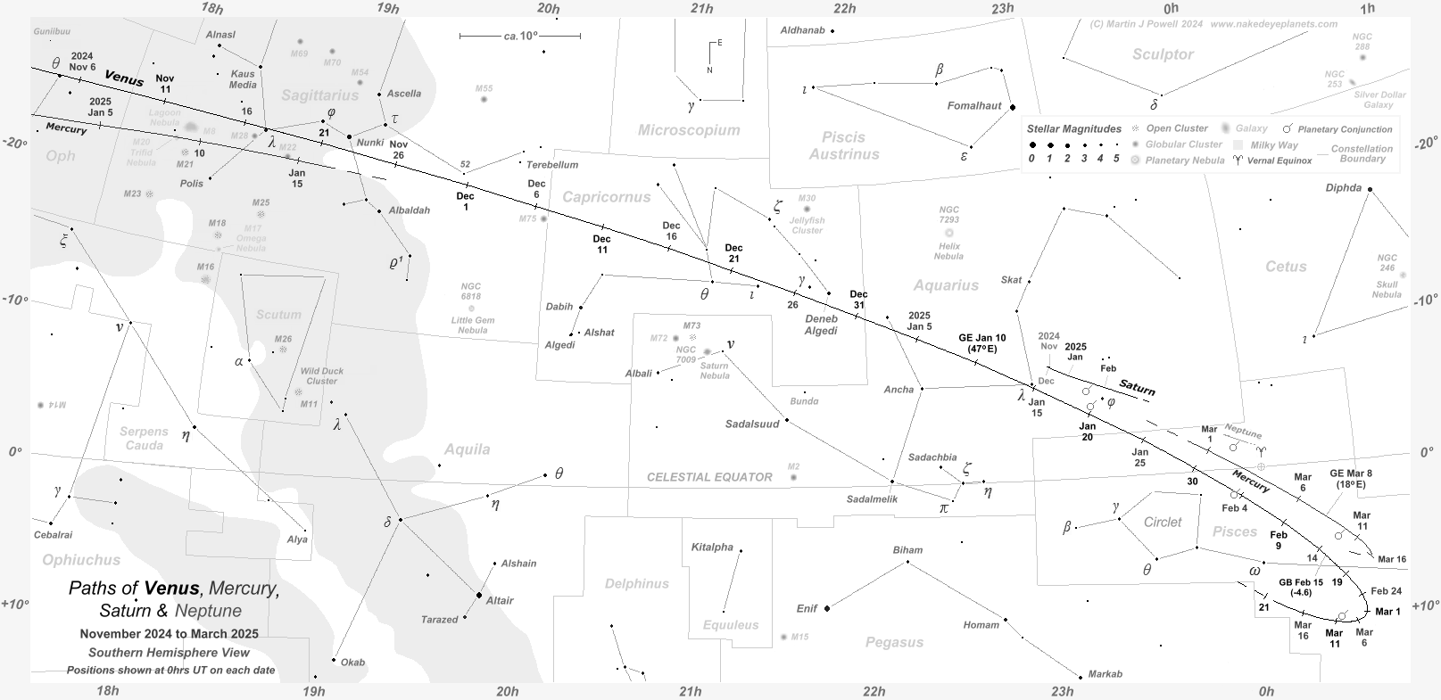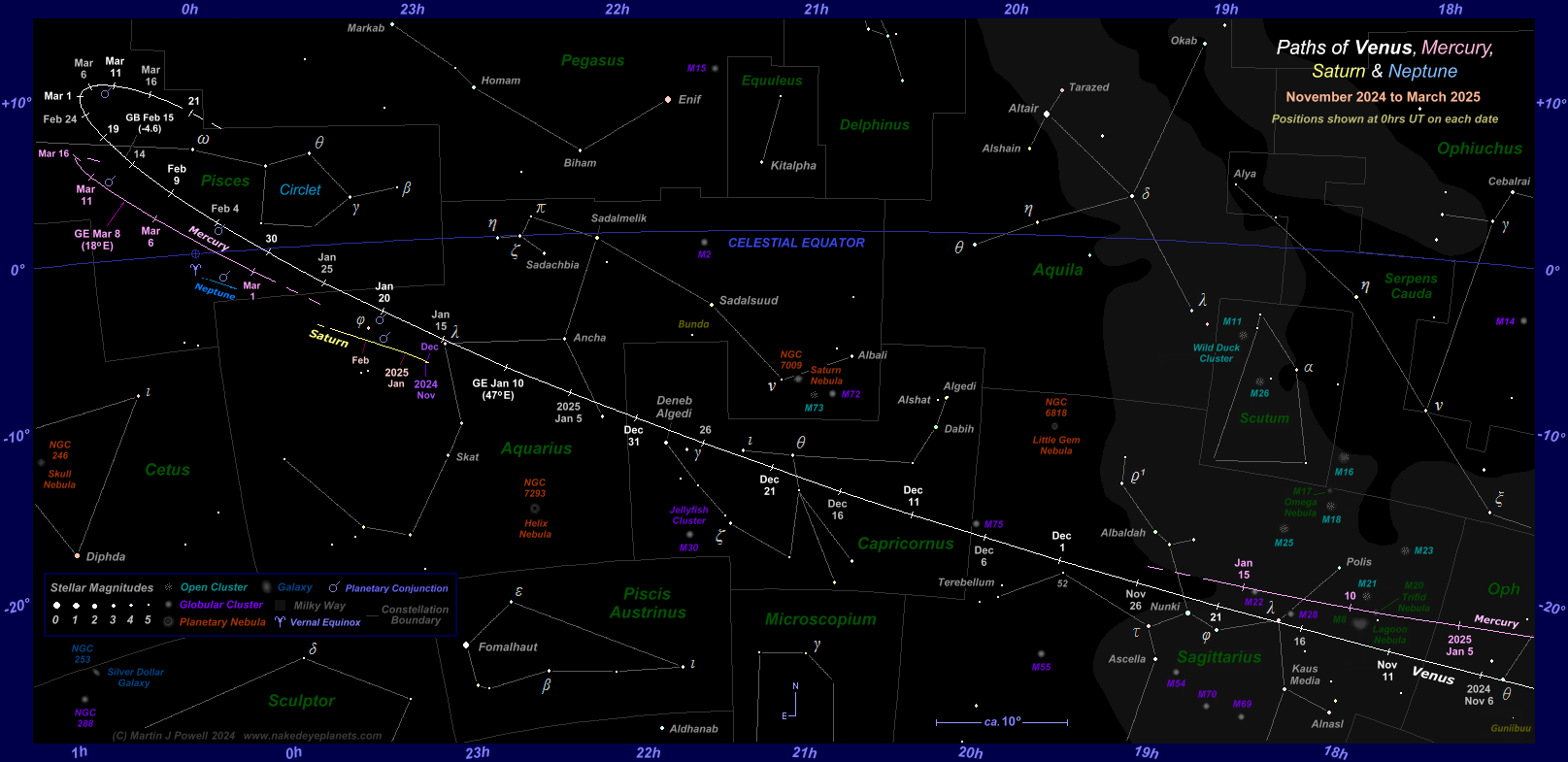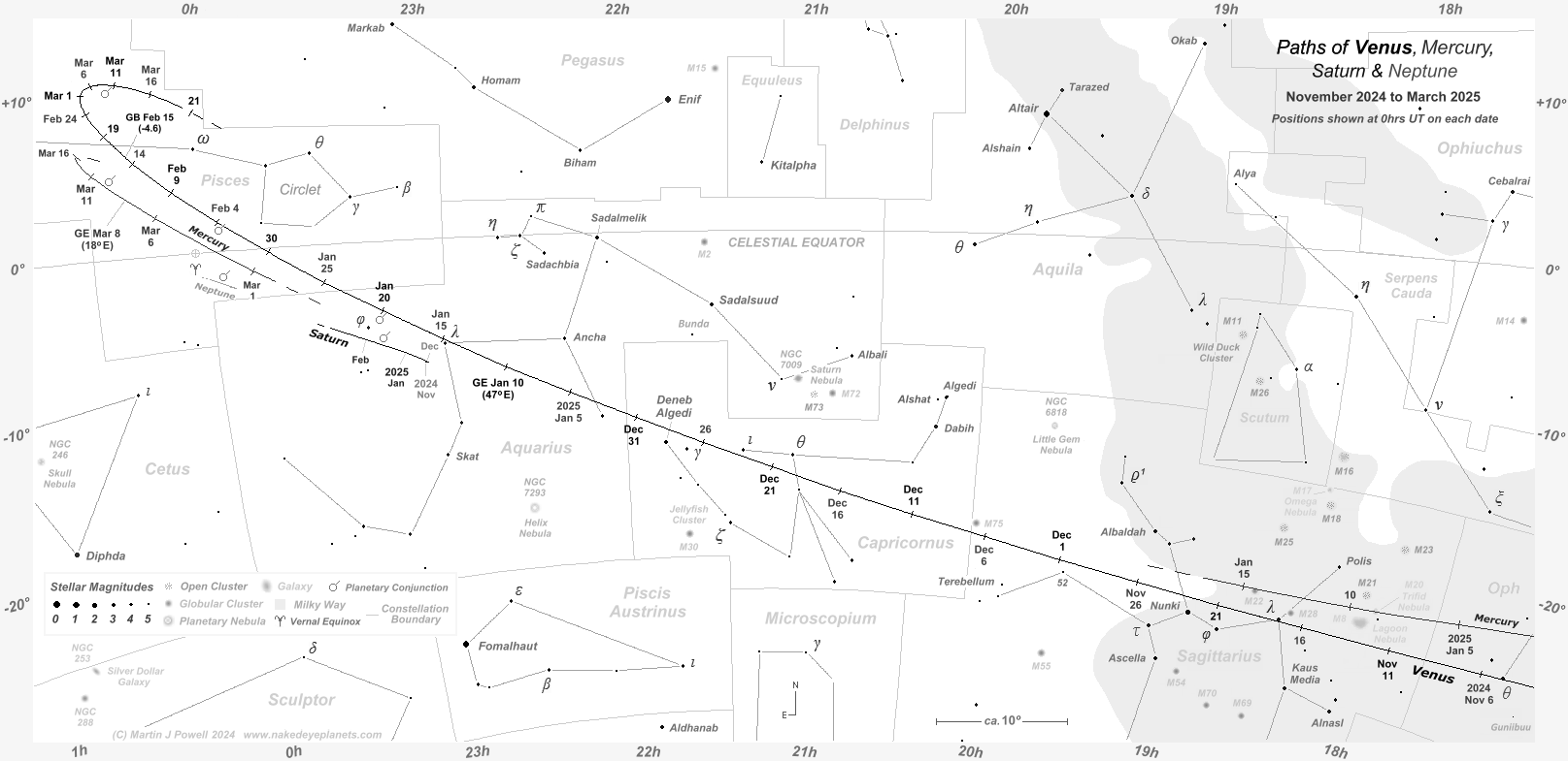 The paths of Venus, Mercury and Saturn through the zodiac constellations during the earlier part of Venus' evening apparition in 2024-25 (click on the thumbnail for the full-size image). The latter part of the planets' apparition is shown in the chart below. Positions are plotted for 0 hrs Universal Time (UT) at 5-day intervals. Both evening and morning apparitions of Mercury are included for the July-October periods, but only the earlier part of the planet's October-November evening apparition is shown. Wherever a planet was too close to the Sun to view, the path is shown by a dashed line (- -). Hence Mercury's evening apparition ended in early August 2024 when it became lost from view in the dusk twilight. The planet was then unobservable for about three weeks before it re-emerged in the morning sky later that same month. Because Mercury is mostly seen under twilit conditions, many of the fainter stars shown in the planet's vicinity may not have been visible when the planet itself was observed. For Venus, apparition data for the dates shown in bright white (at 10-day intervals) are included in the table below. The positions at which Mercury attained greatest elongation from the Sun are indicated by the letters 'GE', with the solar elongation angle in brackets. Eastern elongations apply for evening apparitions and Western elongations for morning apparitions (the elongation of Venus is Easterly throughout the chart coverage). Note that the late June to early August evening apparition of Mercury shown on the chart favoured Southern hemisphere observers (who should refer to the Southern hemisphere chart for a more appropriate orientation) whilst the late August to mid-September morning apparition favoured Northern hemisphere observers. The late October to late November evening apparition - the early part of which appears on the star map - favoured Southern hemisphere observers. The faintest stars shown have an apparent magnitude of about +4.8. Printer-friendly versions of this chart are available for Northern and Southern hemisphere views. Astronomical co-ordinates of Right Ascension (longitude, measured Eastwards in hrs:mins) and Declination (latitude, measured in degrees North or South of the celestial equator) are marked around the border of the chart. Click here to see a star map of the area without planet paths; a printable version can be found here. A