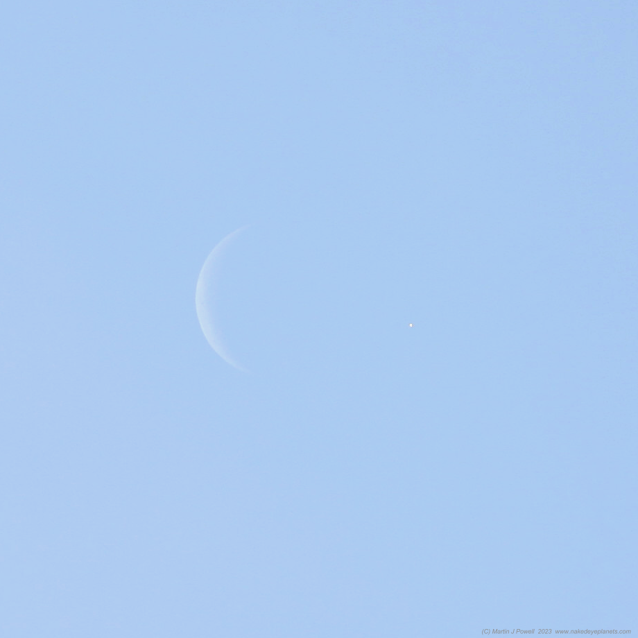 At this early stage of the apparition, dedicated telescopic observers of Venus now begin their search for an elusive phenomemon known as the Ashen Light, which is a faint glowing of the night side of Venus through its thick clouds. The phenomenon is believed to be caused either by the planet's surface glowing red hot (due to its extremely high surface temperature) or due to electrical activity in its dense atmosphere. Observers searching for the Light will normally use ultraviolet and/or infrared filters in order to help reveal it, an occulting bar often being used to block the bright, visually-intrusive crescent from view. Observers in Equatorial and Southern latitudes are best placed to view the Light at this stage of the apparition due to the planet's higher altitude (angle above the horizon) before sunrise.