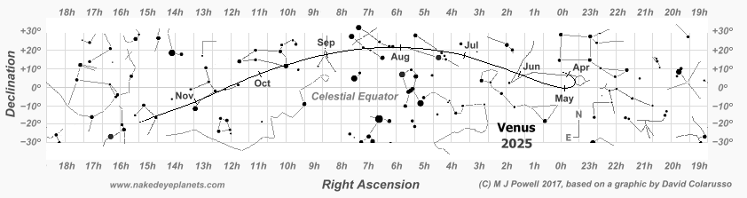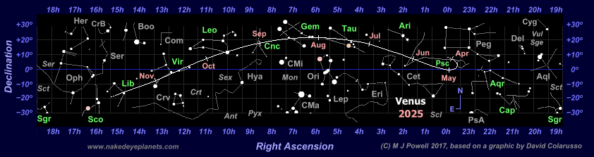 The path of Venus through the zodiac constellations during the planet's morning apparition in 2025 (move your cursor over the image - or click on it - to reveal the constellation names in their abbreviated three-letter form - the full names are listed here). Tick-marks indicate the first day of each month. Zodiac constellations are labelled in green and non-zodiac constellations in grey. The numbers along the sides of the chart (Right Ascension and Declination) are co-ordinates of celestial longitude and latitude which are used to locate the position of celestial bodies in the night sky. A print-friendly version is available here. |
