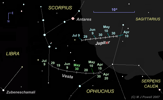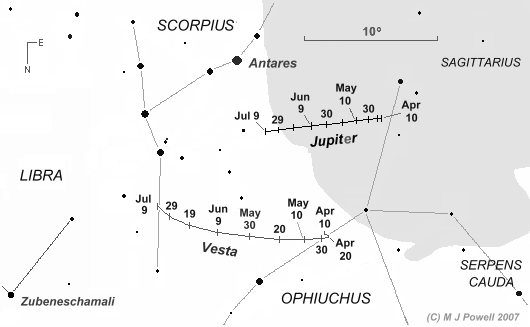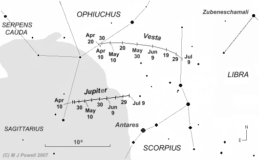 Star map showing the track of asteroid Vesta during its period of naked-eye visibility from April to July 2007. Positions are marked at 10-day intervals. Vesta reached opposition on May 30th, when it shone at an apparent magnitude of +5.4 in the constellation of Ophiuchus; it was discernible to the naked eye from dark sites through to early July, and was easily visible in binoculars from elsewhere. It was the first time in seven years that Vesta had appeared so bright, and it would not be any brighter until the year 2018. The position of Jupiter is also shown for the same period; the brilliant white planet provided an ideal beacon to help in locating the asteroid, whose apparent motion across the sky was discernible in the space of just a few days. Vesta - named after the Roman goddess of the hearth - was the initial destination for NASA's Dawn mission, which launched in September 2007 and entered orbit around the asteroid in July 2011. The above diagram shows the view as seen from the Northern hemisphere - for the Southern hemisphere view, click here. Printer-friendly versions of the starmap are available for Northern and Southern hemisphere views. |