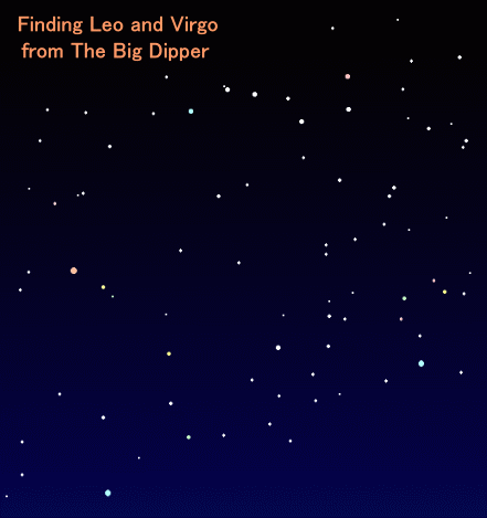 Diagram showing a simple method of finding Boötes, Leo and Virgo using the 'Big Dipper' (or 'Plough') asterism in Ursa Major (an animated version can be seen here). |
