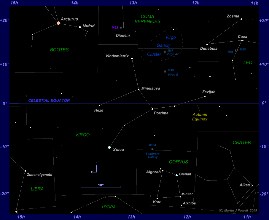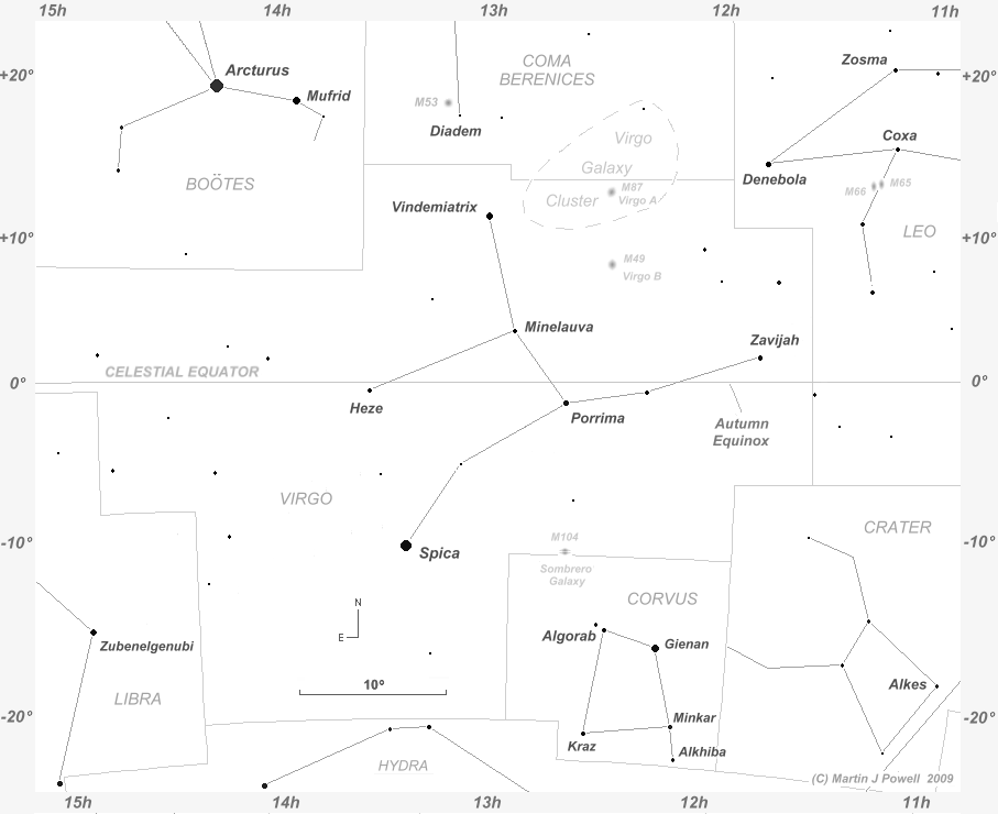 Star map showing the region of the night sky around the constellations Cancer, Leo and Virgo (click on the image for a full-size version). The star map applies to observers in the Northern hemisphere (i.e. North is up); Southern hemisphere observers should invert the map (South up) to obtain a correct orientation. Constellations to the East and South of Virgo are shown in a separate star map below. The faintest stars on the map have an apparent magnitude of about +4.8. A printer-friendly version of this map is available here. Co-ordinates of Right Ascension (astronomical longitude) and Declination (astronomical latitude) are marked around the border of the chart. Also included on the star map are numerous deep-sky objects (objects beyond our Solar System) which can be seen through binoculars and small telescopes; these are detailed in the main text below. |